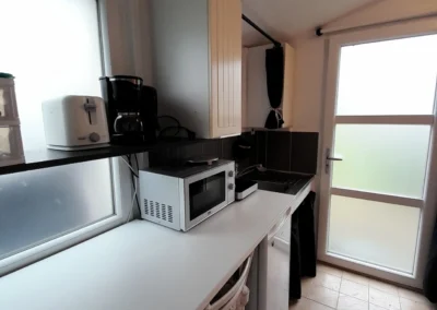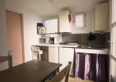 - Au rez-de-chaussée, une cuisine indépendante installée dans la dépendance du jardin, équipée de tout le nécessaire pour préparer vos repas. Une petite table avec chaises, une TV et le wi-fi complètent cet espace convivial. Vous y trouverez également une salle d’eau fermée avec douche, lavabo et WC.