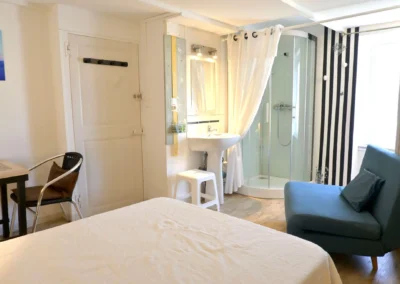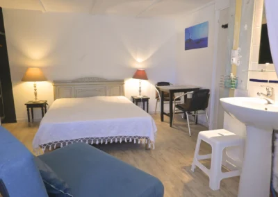 - À l’étage de la maison, la chambre, orientée à l’ouest, vous offre un lit double (140×190), des rangements et un coin détente avec table, chaises, cafetière et bouilloire pour vos réveils face à la lumière de l’île. Pour une troisième personne, une chauffeuse peut être aménagée avec un matelas supplémentaire. La chambre dispose aussi d’une petite salle d’eau ouverte, séparée par un rideau de discrétion.